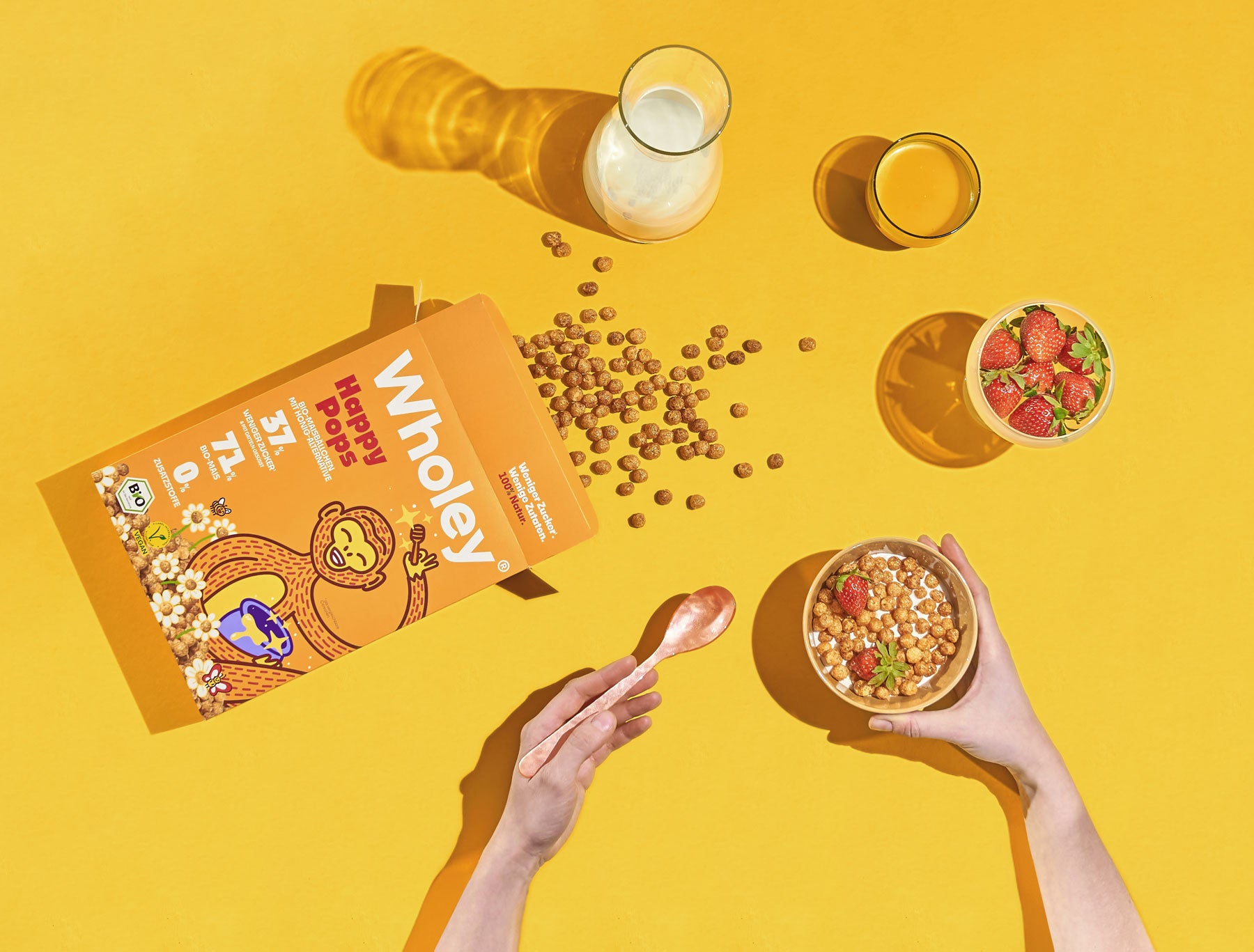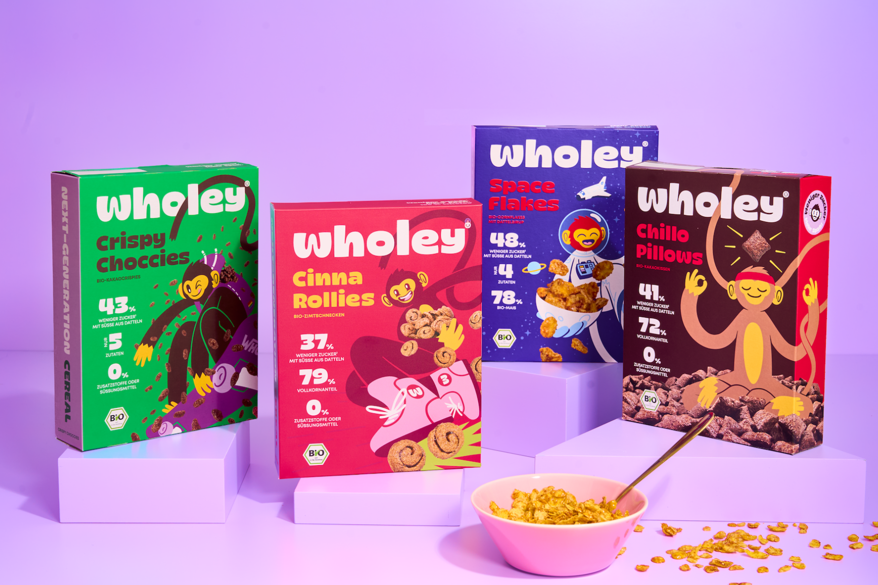 Endlich wieder Cereals zum Frühstück! Wholey Bio-Cereals schmecken ganz ohne raffinierten Zucker richtig lecker – und machen darum gleich doppelt gute Laune.