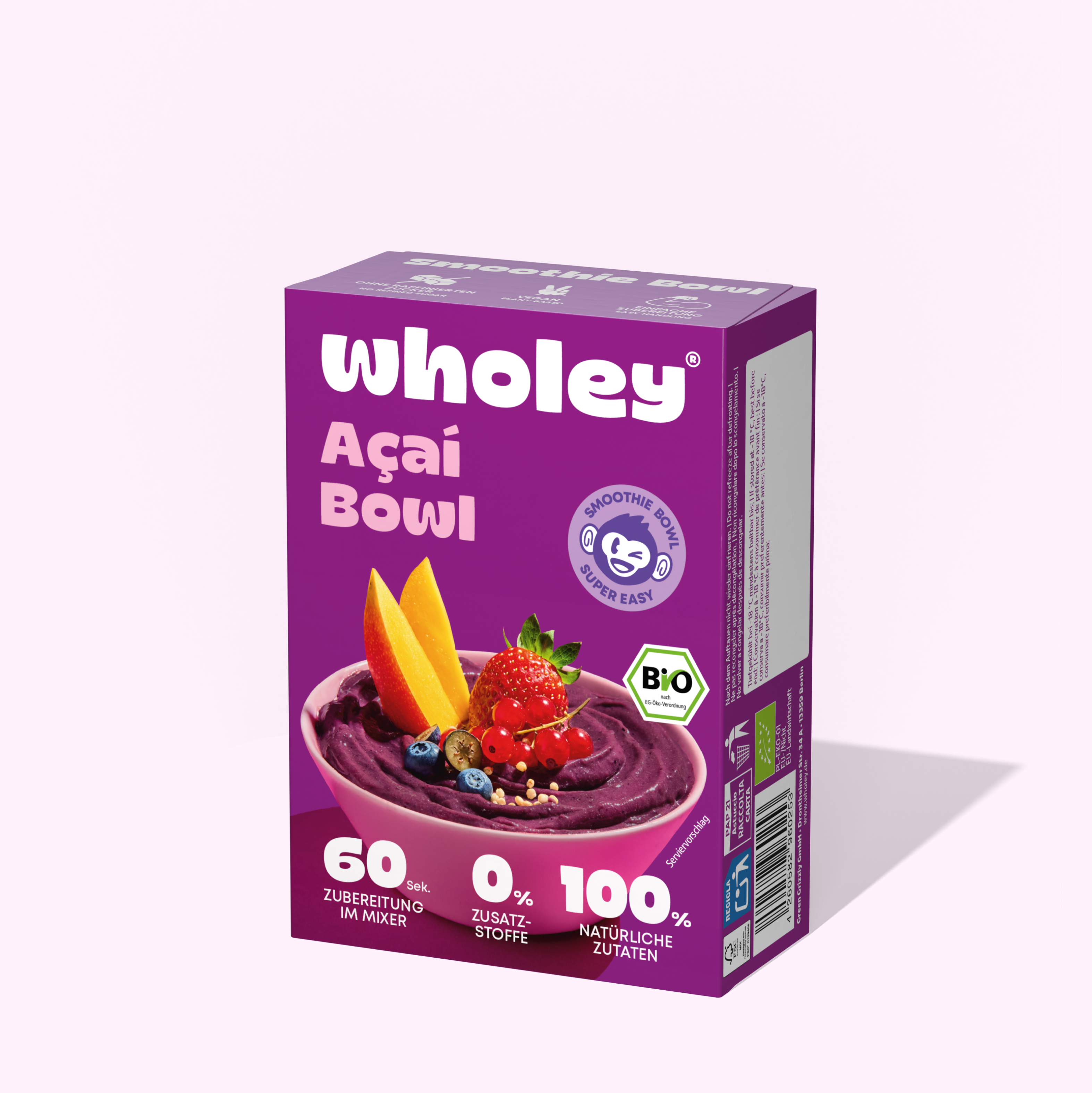 Ganz ehrlich? Unsere Açaí Bowl hat es in sich: Neben purem Açaí Püree stecken auch Banane, Erdbeeren, Heidelbeeren, Datteln und Kokosnuss in der Frozen Bowl – eine unschlagbare Kombination für deinen fruchtigen Start in den Tag. Packung auf, Mixer an: So easy und schnell hast du das Superfood aus Brasilien in der Frühstücksschüssel.